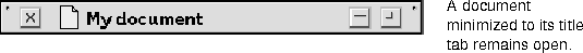 The minimizer lets the user reduce the window to its title tab. When the user clicks the minimizer, the window is reduced to its tab, which remains in its current location onscreen. Clicking the minimizer again restores the window to its original size.