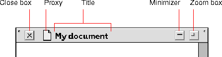 A proxy icon appears in the title tabs of both document and container windows. This icon acts as a proxy for drag-and-drop operations. For example, the user could drag the proxy icon for a document to the trash without having to find the document's icon in the container where it resides.