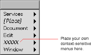 As a developer, you can provide additional context-sensitive menus for items that do not fit on the standard set. These menus will often apply to the current selection, so they should appear after the Edit menu and before the Window menu.