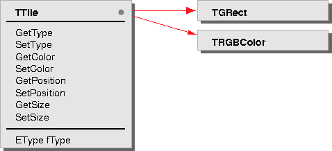 In addition to a default and copy constructor, TTile defines a constructor that lets you create a tile of a specific kind, color, size and position. This diagram shows the complete interface for the class TTile:
