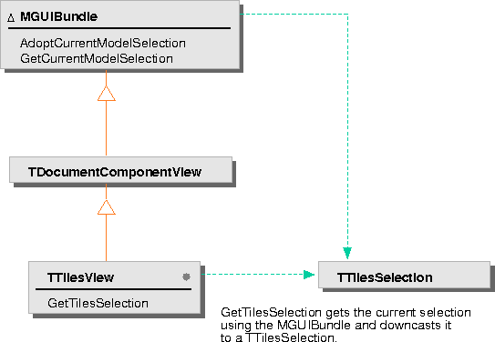 Because GetCurrentModelSelection returns a pointer to the base selection class, it is a good idea to provide a function that downcasts the returned selection to the selection class for your model. TTilesView provides such a convenience function, GetTilesSelection. This function calls the MGUIBundle function GetCurrentModelSelection and downcasts the result to a pointer to a TTilesSelection. It returns 0 if there is no current selection on the Tiles model, so you should verify the returned pointer before using it.