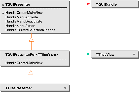 In this step, instead of using TGUIPresenterFor<TTilesView> directly, the Tiles document component uses a presenter derived from TGUIPresenterFor<TTilesView>--TTilesPresenter--that builds a menu specifically for the Tiles program. TGUIPresenterFor<AView> derives from TGUIPresenter, which provides functions called by the Presentation framework to build menus and to control their behavior. You override these functions to build and manage the extended Tiles menu: