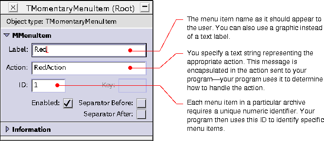 For each menu item you create, you need to specify a label, an associated action, and a menu ID number. You can specify this information by opening an Inspector window for the item, as shown: