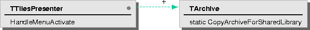 The TArchive class provides a static function, CopyArchiveForSharedLibrary, that returns the archive associated with the shared library in which the calling function is defined. For example, if call this function from TTilesPresenter::HandleActivateMenu and it returns the archive TilesTutorialLib.archive