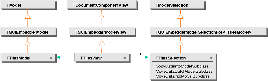 In this step, the classes representing the major components of the Tiles program--model, view, and selection--are modified to derive from the three embedder classes described above. With the exception of TTilesSelection, this change doesn't require any additional or changed functions (the GUI embedder classes derive from the same classes that the Tiles classes were originally derived from).