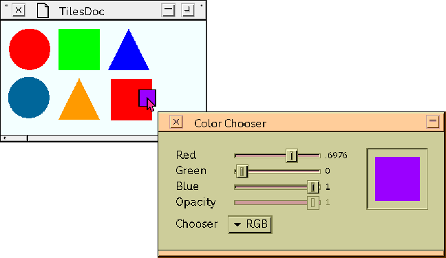 For example, this figure shows how you would drag a color item from ColorChooser to a Tiles document--whatever tile you drop the color on turns the color of the dragged item: