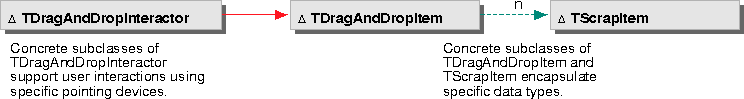 Classes derived from TDragAndDropItem and TScrapItem also have to define how the actual data is transported. Generally, you don't want to physically carry all the data for each scrap item in the drag and drop item because only one representation will be required to complete the interaction (or none, if the user doesn't drop the item on a drop acceptor). Scrap item classes should be able to access the data and assemble the correct representation when they are actually dropped on the appropriate destination instead of when the drag and drop item is constructed.