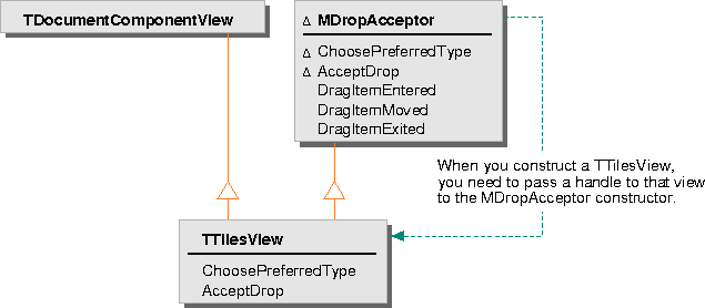 To enable a Tiles document to be a drop acceptor for color items, you need to mix the class MDropAcceptor into TTilesView class. MDropAcceptor defines two important functions that your view class must override to define how it will handle dropped items: