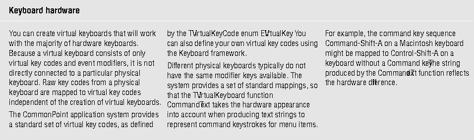 TStandardEditableVirtualKeyboard encapsulates a set of mapping rules for keys corresponding to the keys on standard physical keyboards (IBM and Macintosh). You can use this class to create a keyboard layout for use on any physical keyboard containing a subset of the virtual keys defined by the EVirtualKeyCode enum.