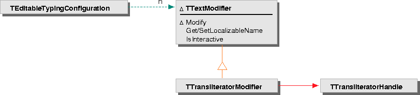 The typing configuration encapsulates text modifiers using the abstract class TTextModifier. Derived classes encapsulate a particular kind of modifier. Currently the only concrete class is TTransliteratorModifier.
