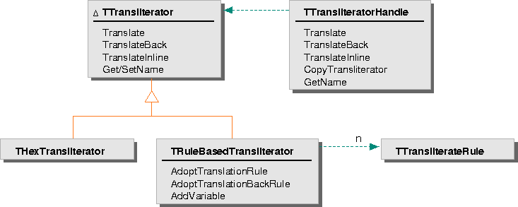 TTransliteratorHandle provides a lightweight mechanism for referencing a particular instance of a transliterator class. Because a transliterator encapsulates a large amount of data, use this class to access a transliterator unless you need to specifically access individual rules. You can create a handle referencing one of the existing transliterators using the transliterator's name. For example: