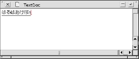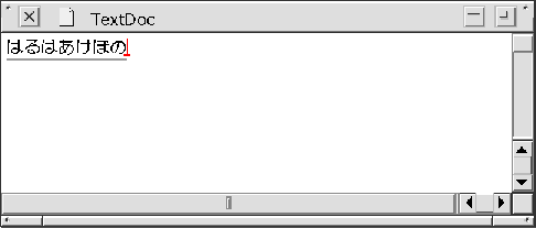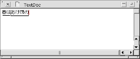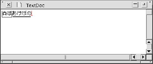 The CommonPoint application system provides a Japanese typing configuration that includes the Writing Heads input method. The Text Editing framework supports using this typing configuration and provides a simple user interface for the input method, including visual feedback for the active area and for selected phrases, and key commands for selecting phrases and alternate homophones and for confirming the text. The following illustrations show how you would enter text using this input method and what you would see.