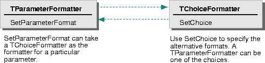 Use TChoiceFormatter instances by nesting them within a TParameterFormatter instance. Create the TChoiceFormatter and then use the TParameterFormatter::SetParameterFormat member function to attach it to the appropriate segment in the text template.