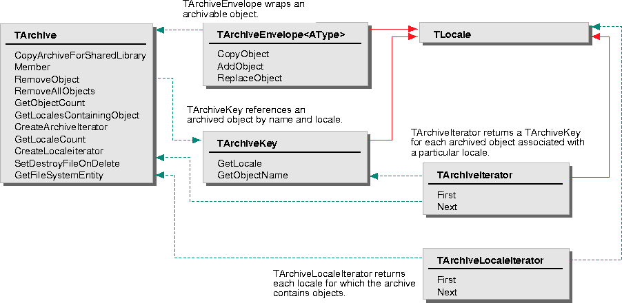 TArchiveEnvelope provides a wrapper for an archivable object, along with the protocol for adding objects to an archive and retrieving objects from an archive. You instantiate a TArchiveEnvelope for a particular type of object and identify the object you want to add or retrieve by its name (a text instance). A TArchiveEnvelope instance is bound to a specific archive and either the current locale or a locale you specify.