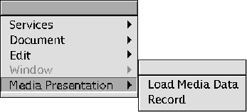 Like other types of documents, users can create or open media documents using RunDocument, or by opening a media document icon or media stationery in the Workspace. Once a document is open, different media clips of the same type can be loaded using the Load Media Data command from the Media Presentation menu: