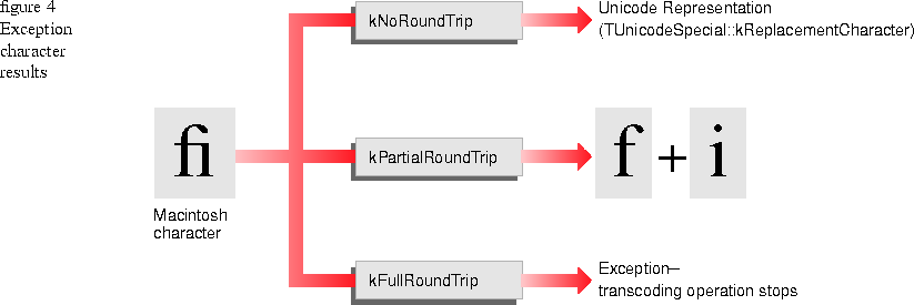 Transcoding data with the kNoRoundTrip option is the simplest mechanism because characters have a one-to-one mapping and you can easily calculate storage needs. If you want to transcode text using either the kPartialRoundTrip or kFullRoundTrip option, you must consider how you will allocate storage. Exception characters might expand into two characters, so calculating storage needs based on the length of the input text might not be adequate.