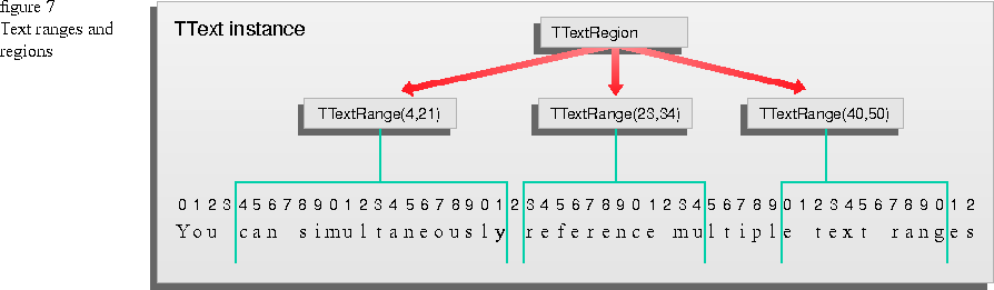 To simultaneously reference multiple text ranges, use a TTextRegion object. A text region object describes an arbitrary one-dimensional text region, consisting of one or more text ranges that might or might not be contiguous.