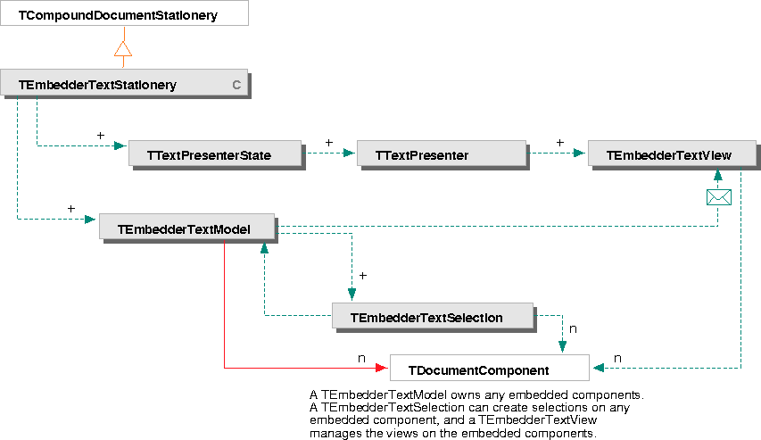 These classes work together in the same way the standard editable text document component classes work together. The framework also provides a stationery class, TEmbedderTextStationery, that you can use with RunDocument to quickly instantiate a text component that handles embedding--for example:
