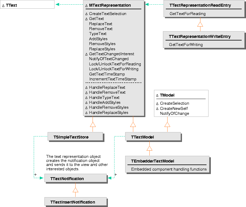 MTextRepresentation also provides the interfaces for enabling synchronized access to the data, for creating the correct selection object for selecting stored data, and for issuing change notifications. Specific implementations of notification and synchronization are described below in "Text Editing framework notification mechanisms" and "Synchronizing data access."