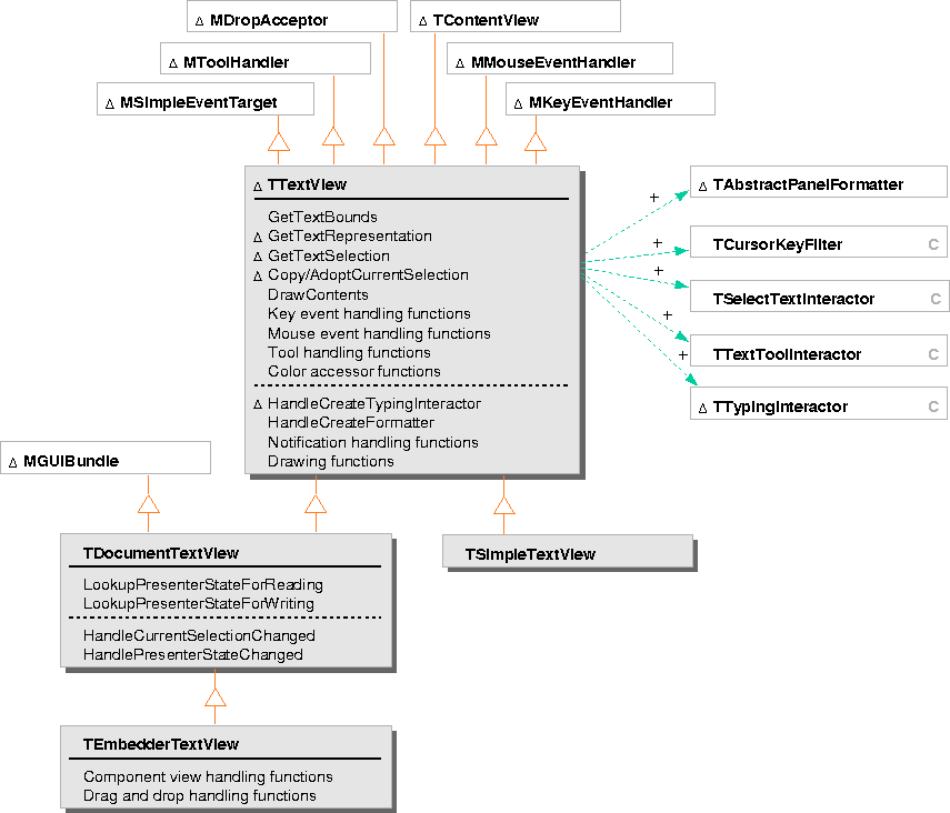 TTextView is the abstract base class for views on text data, providing the protocol for drawing the text, handling input events, and accessing the associated text representation object and current selection.