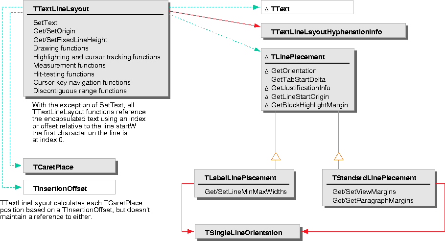 TTextLineLayout is responsible for measuring, highlighting, displaying, and hit-testing a line of text. TTextLineLayout uses a TLinePlacement to describe information about the position of the line.