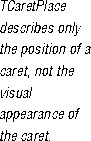 TCaretPlace describes the position at which a caret should be displayed on a line. Each TCaretPlace is defined by a position (a TGPoint) and a slope. The slope is used to draw a caret with a slope compatible with the immediate text. TTextLineLayout calculates caret positions using the current TInsertionOffset. TInsertionOffset is part of the Basic Text framework and is described in "Representing insertion points" on page 39.