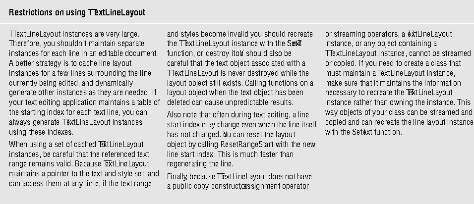 However, be aware that after calling SetText, the next time you call any other function on the line the TTextLineLayout regenerates the line. While SetText is a relatively low-overhead function, the subsequent regeneration of the line is a much slower process. Therefore, avoid calling SetText unnecessarily.
