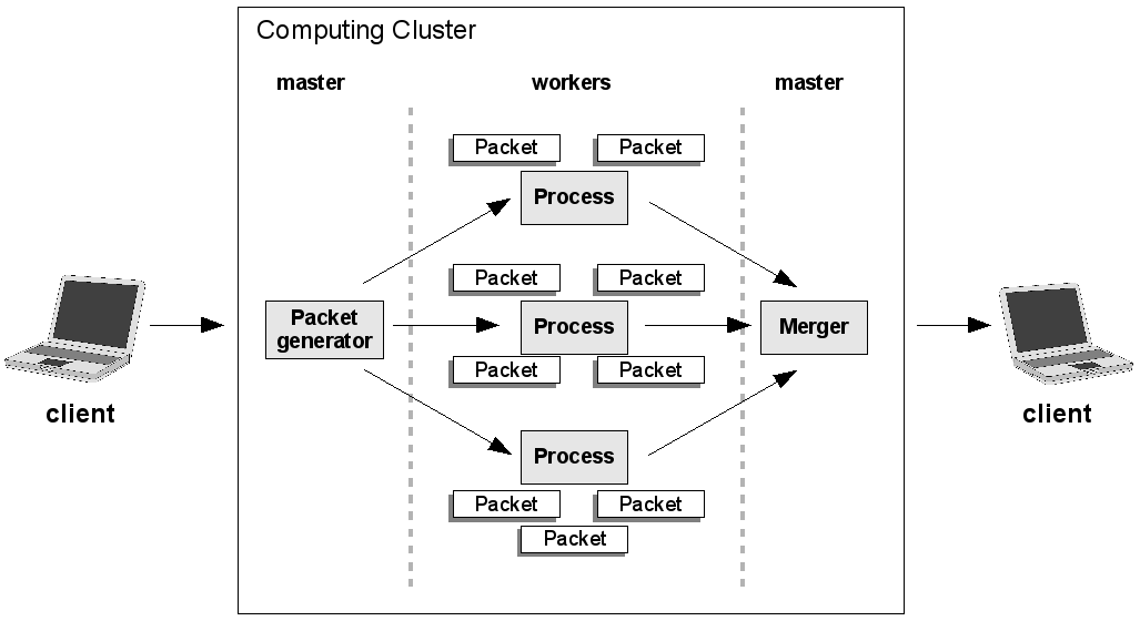 One of the ideas idea behind PROOF is to minimize the execution time by having all contributing workers terminating their assigned task at the same time. This is achieved by using fine-grained work distribution, where the amount of work assigned to a worker, also called a packet, is determined dynamically following the real-time performance of the workers. In principle, the packet can be as small as the basic unit, the event.