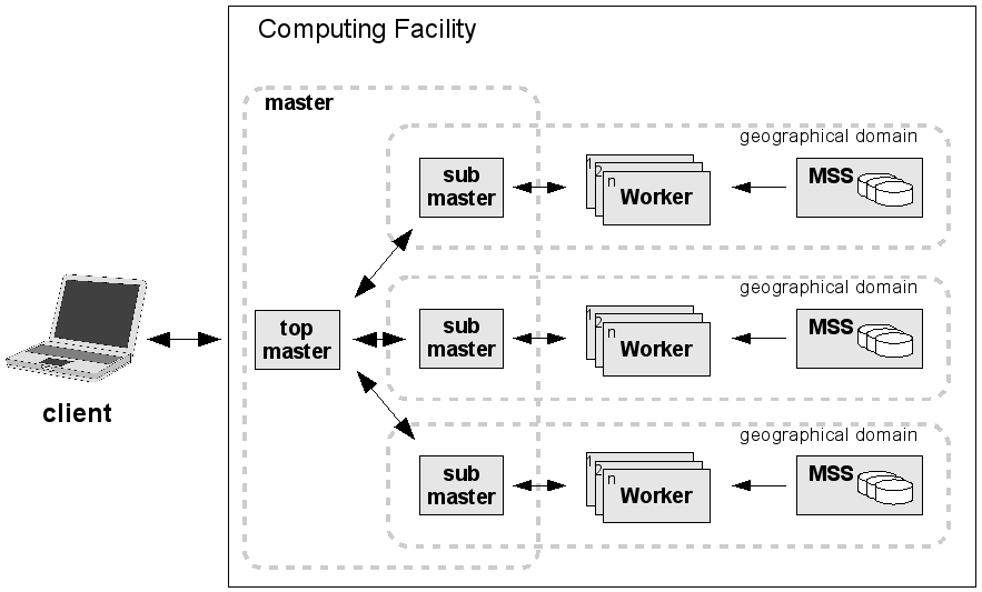 The client is the user that wants to use the resources to perform a task. The master is the entry point to the computing facility: it parses the client requests, it distributes the work to the workers, it collects and merges the results. The master tier can be multi-layered. This allows, for example, to federate geographically separated clusters by optimizing the access to auxilliary resources, like mass storages. It also allows to distribute the distribution and merging work, which may become the bottle-neck in the case of many workers.