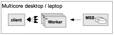 PROOF-Lite, the version of PROOF dedicated to multicore desktops, implements a two-tier architecture where the master is merged into the client, the latter being in direct control of the workers: