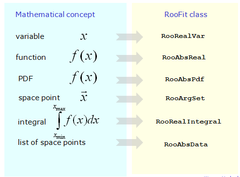 RooFit introduces a granular structure in its mapping of mathematical data models components to C++ objects: rather than aiming at a monolithic entity that describes a data model, each math symbol is presented by a separate object. A feature of this design philosophy is that all RooFit models always consist of multiple objects.