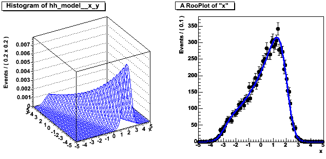 Fitting, plotting and event generation with multi-dimensional p.d.f.s is very similar to that of one-dimensional p.d.f.s. Continuing the above example, one can use