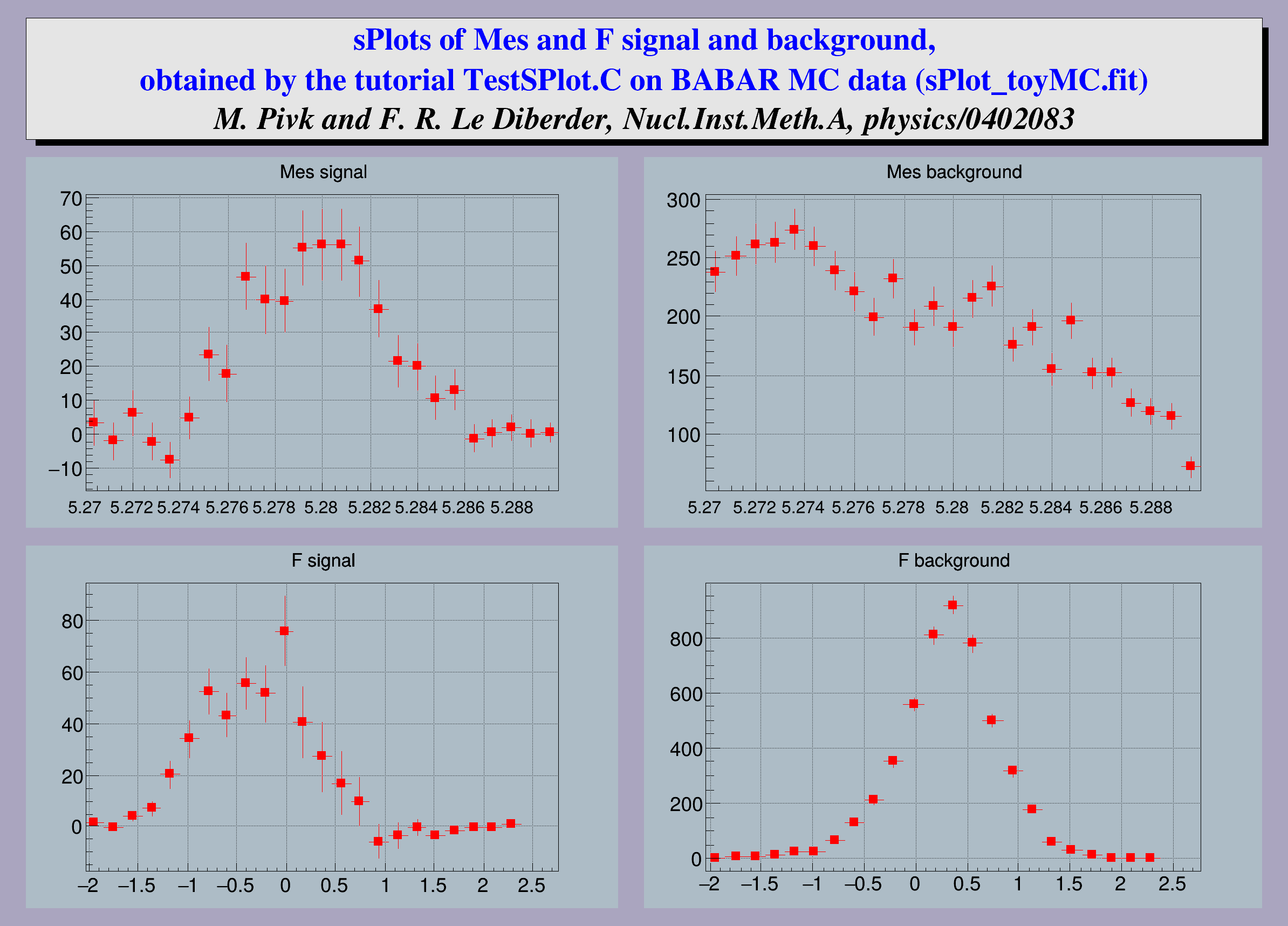 It is an example of analysis of charmless B decays, performed for BABAR. One is dealing with a data sample in which two species are present: the first is termed signal and the second background. A maximum Likelihood fit is performed to obtain the two yields N1 and N2 The fit relies on two discriminating variables collectively denoted y, which are chosen within three possible variables denoted Mes, dE and F. The variable which is not incorporated in y, is used as the control variable x. The distributions of discriminating variables and more details about the method can be found in the TSPlot class description