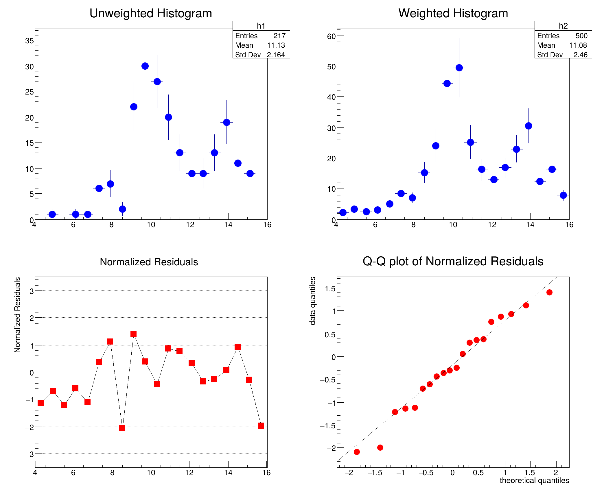 One unweighted histogram is compared with a weighted histogram. The normalized residuals are retrieved and plotted in a simple graph. The QQ plot of the normalized residual using the normal distribution is also plotted.