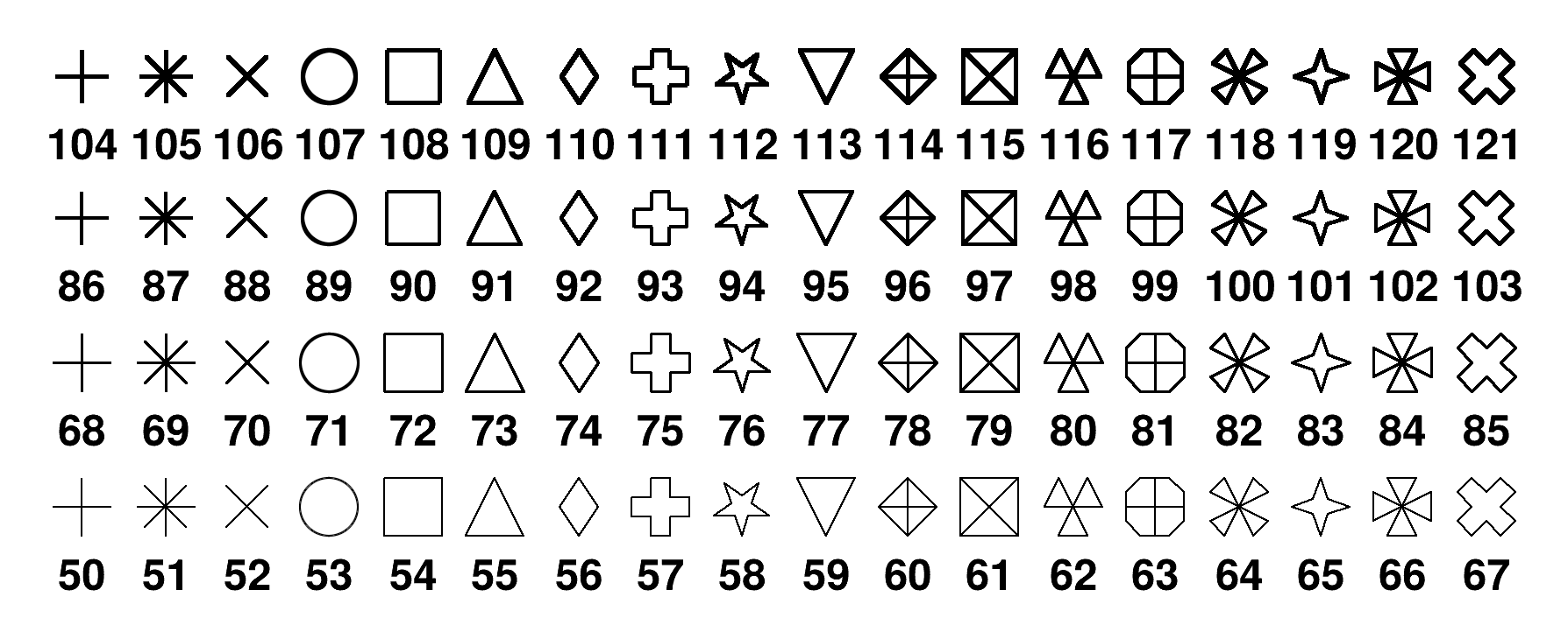 The following list gives the currently supported markers (screen and PostScript) style. Each marker style is identified by an integer number (first column) corresponding to a marker shape (second column) and can be also accessed via a global name (third column).