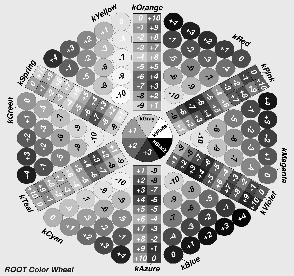 One can toggle between a grayscale preview and the regular colored mode using TCanvas::SetGrayscale(). Note that in grayscale mode, access via RGB will return grayscale values according to ITU standards (and close to b&w printer gray-scales), while access via HLS returns de-saturated gray-scales. The image below shows the ROOT color wheel in grayscale mode.