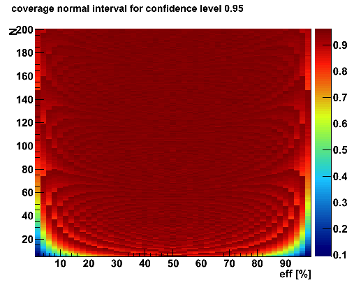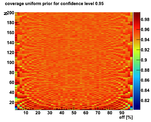The following pictures illustrate the actual coverage probability for the different values of the true efficiency and the total number of events when a confidence level of 95% is desired.