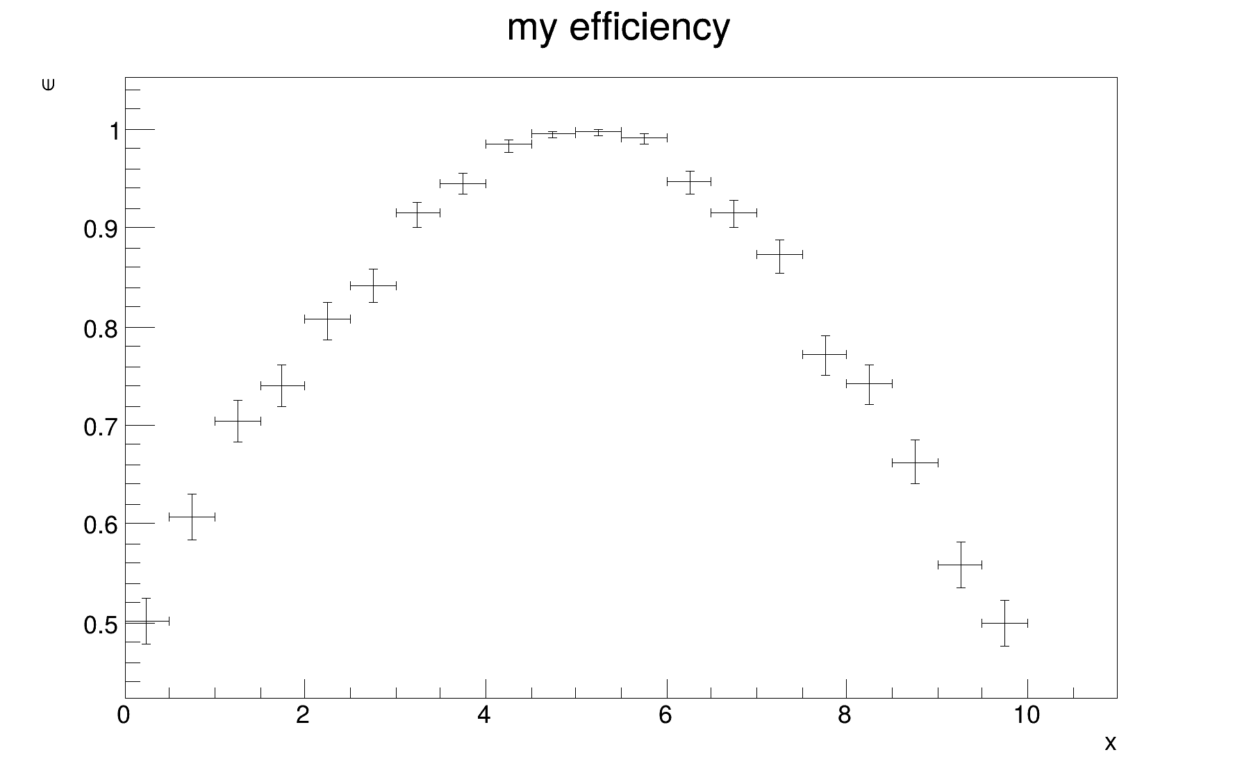 TEfficiency* pEff = new TEfficiency("eff","my efficiency;x;y;#epsilon",10,0,10,20,-5,5);