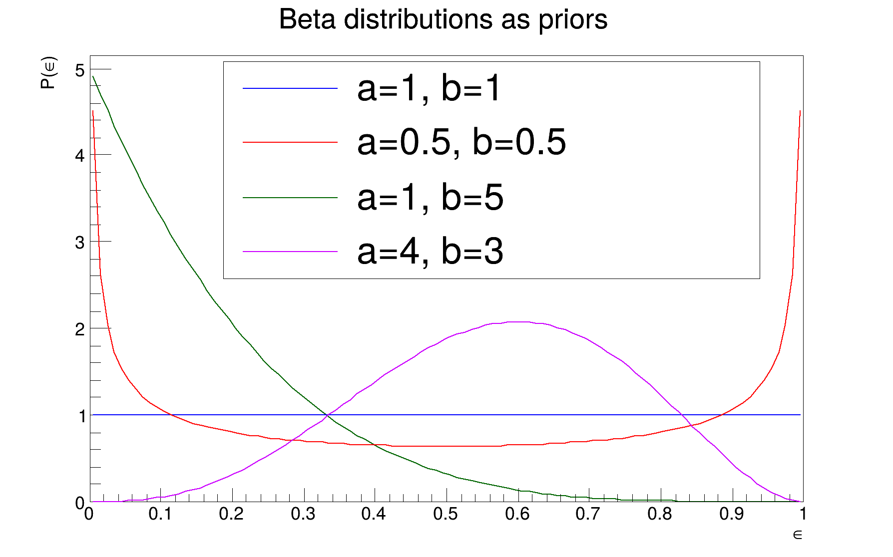 The prior probability of the efficiency in Bayesian statistics can be given in terms of a beta distribution. The beta distribution has two positive shape parameters. The resulting priors for different combinations of these shape parameters are shown in the plot below.