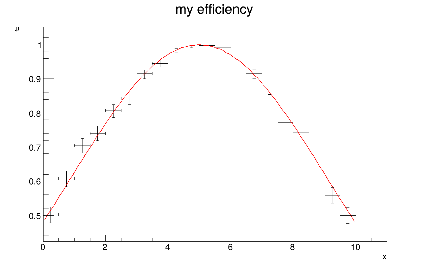 The efficiency can be fitted using the TEfficiency::Fit function which internally uses the TBinomialEfficiencyFitter::Fit method. As this method is using a maximum-likelihood-fit, it is necessary to initialise the given fit function with reasonable start values. The resulting fit function is attached to the list of associated functions and will be drawn automatically during the next TEfficiency::Draw command. The list of associated function can be modified by using the pointer returned by TEfficiency::GetListOfFunctions.