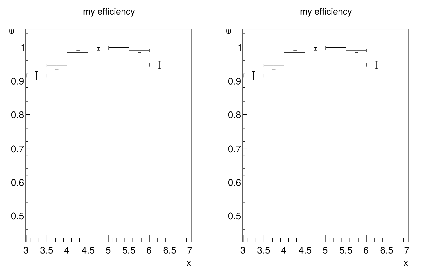 This procedure has the advantage that you can change the weight of one subsample easily without rerunning the whole analysis. On the other hand, more effort is needed to handle several TEfficiency objects instead of one histogram. In the case of many different or even continuously distributed weights, this approach becomes cumbersome. One possibility to overcome this problem is the usage of binned weights.