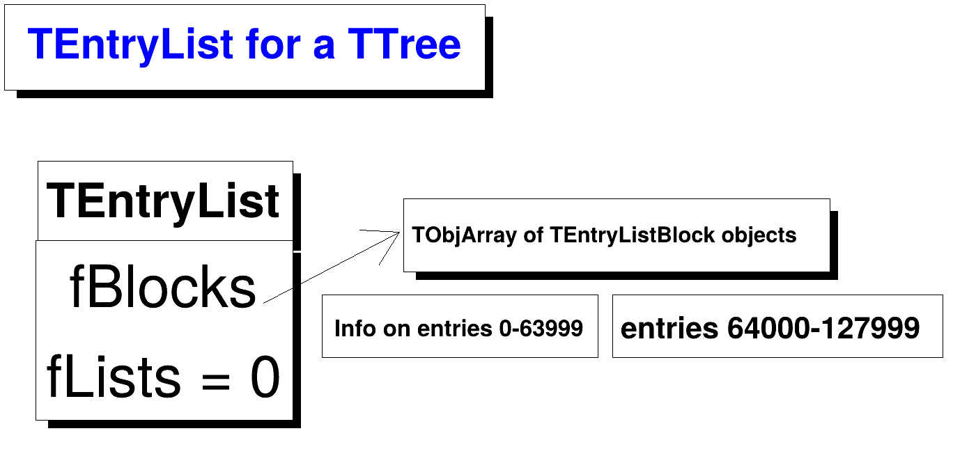 for a TTree (fBlocks data member is non-zero) Entry numbers are stored in TEntryListBlocks, which, in their turn, are stored in the TObjArray fBlocks. The range of the entry numbers is cut into intervals of kBlockSize entries (currently 64000), so that the first block contains information which entries out of the first 64000 pass the selection, the second block - which entries out of the 64000-127999 interval pass the selection, etc. Some blocks, obviously, might be empty. The internal representation of entry numbers in the blocks is described in the TEntryListBlock class description, and this representation might be changed by calling OptimizeStorage() function (when the list is filled via the Enter() function, this is done automatically, except for the last block). Individual entry lists can be merged (functions Merge() and Add()) to make an entry list for a TChain of corresponding TTrees.
