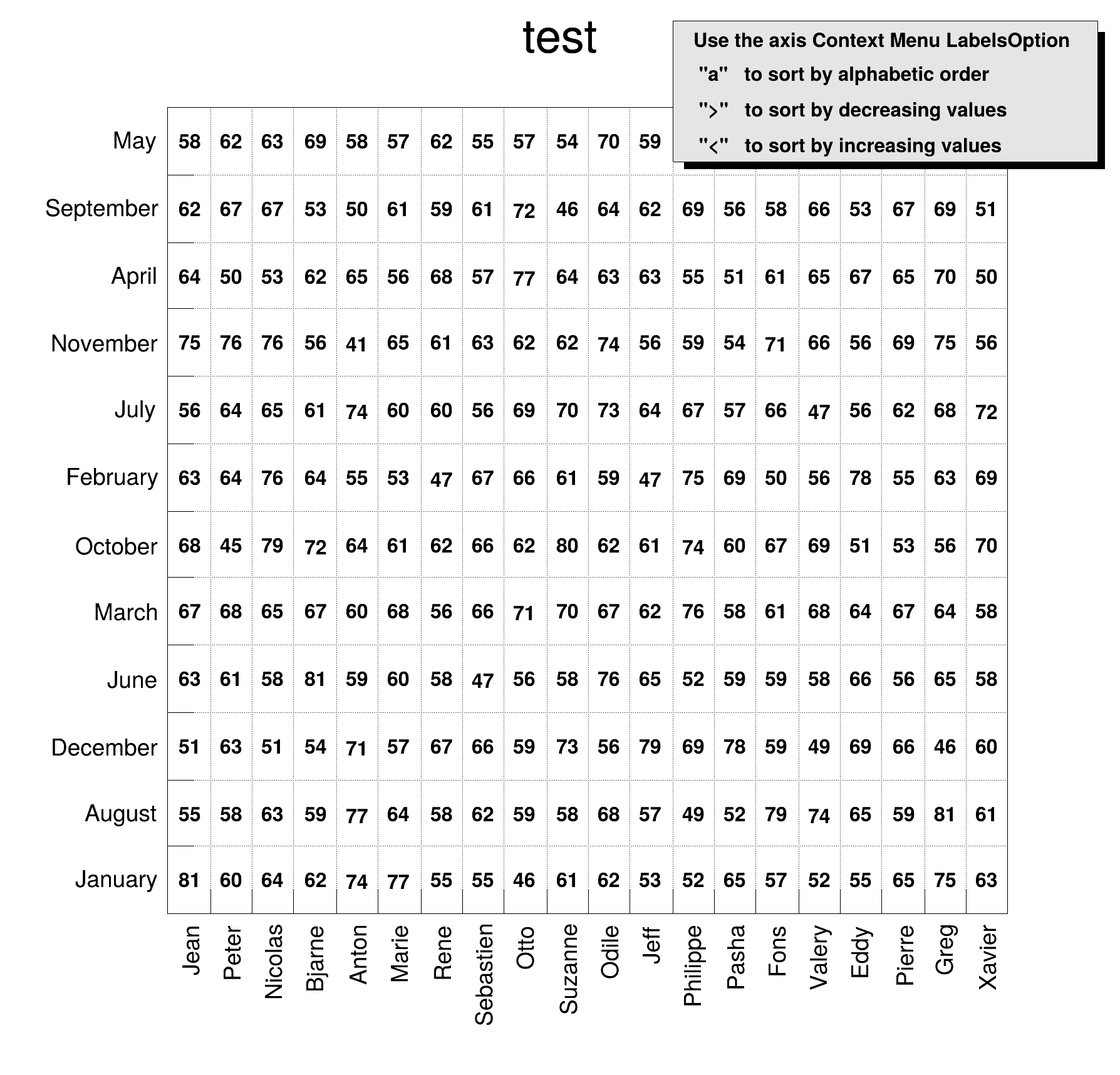 Axis labels can be any alphanumeric character strings. Such axis can be produced only with histograms because the labels'definition is stored in TAxis. The following example demonstrates how to create such labels.