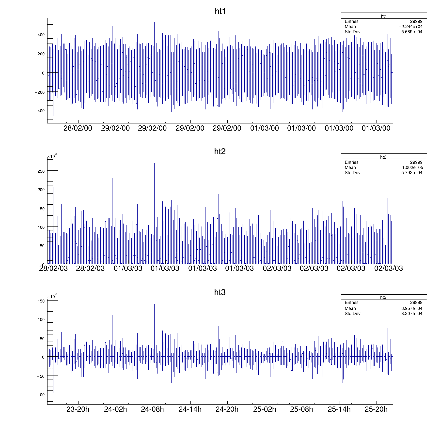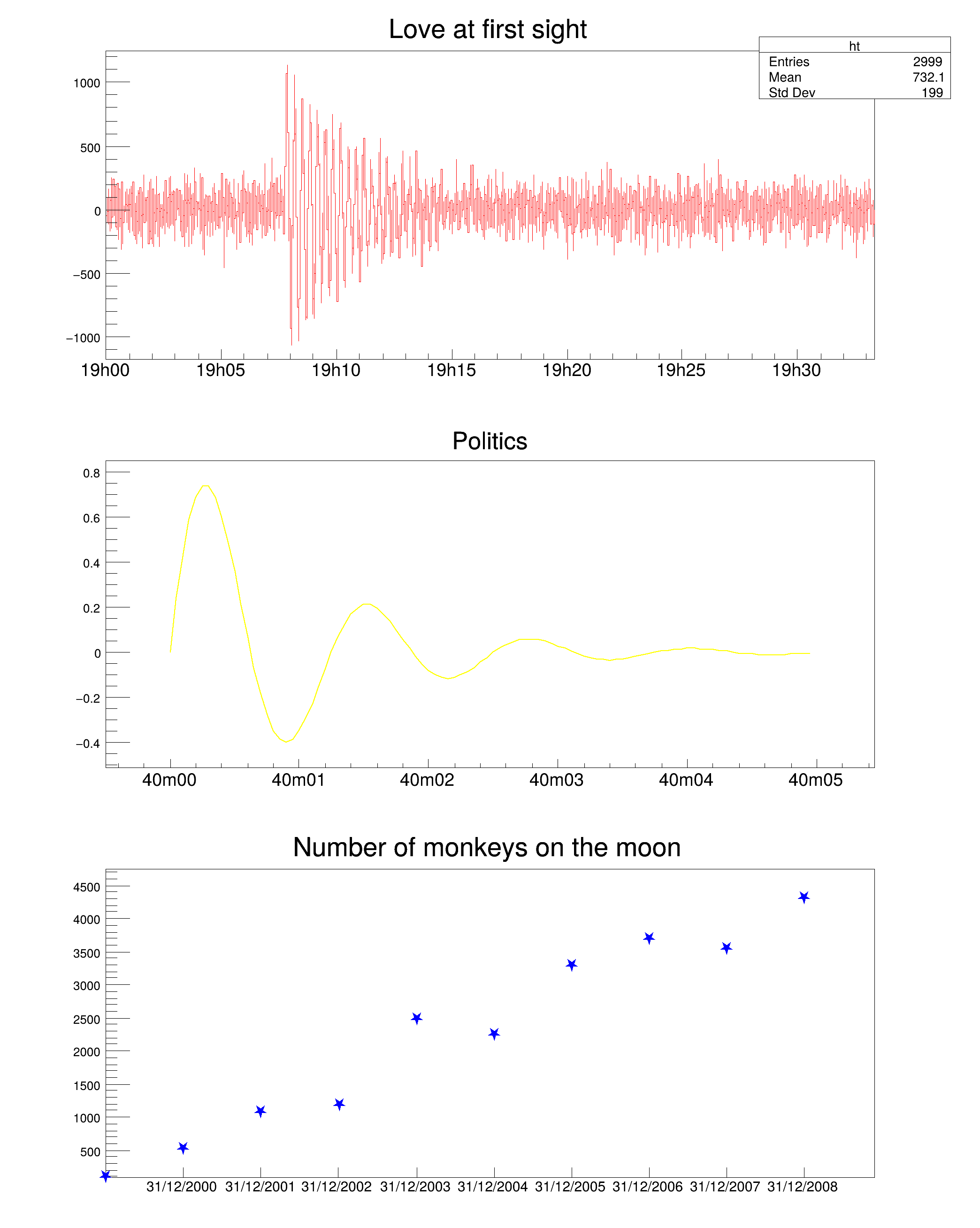 gPad->SetGridy(1); set the grid on the X axisgPad->SetGridx(1); set the grid on the Y axisgPad->SetGrid(1,1); set the grid on both axis.Histograms' axis can be defined as "time axis". To do that it is enough to activate the TAxis::SetTimeDisplay attribute on a given axis. If h is an histogram, it is done the following way: