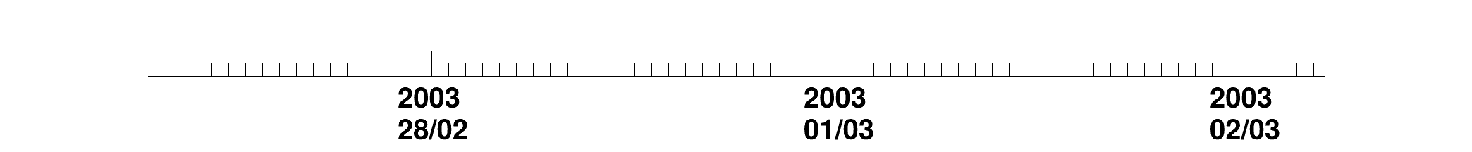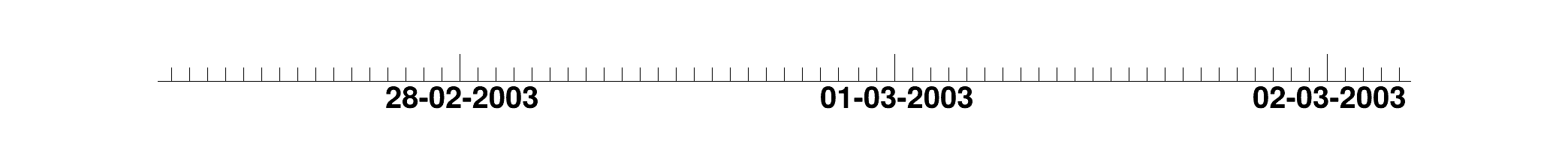 The time offset can be defined using one of the three methods described before. The time axis will spread around the time offset value. Actually it will go from TimeOffset+wmin to TimeOffset+wmax where wmin and wmax are the minimum and maximum values (in seconds) of the axis. Let's take again an example. Having defined "2003, February 28 at 12h" we would like to see the axis a day before and a day after. A TGaxis can be created the following way (a day has 86400 seconds):