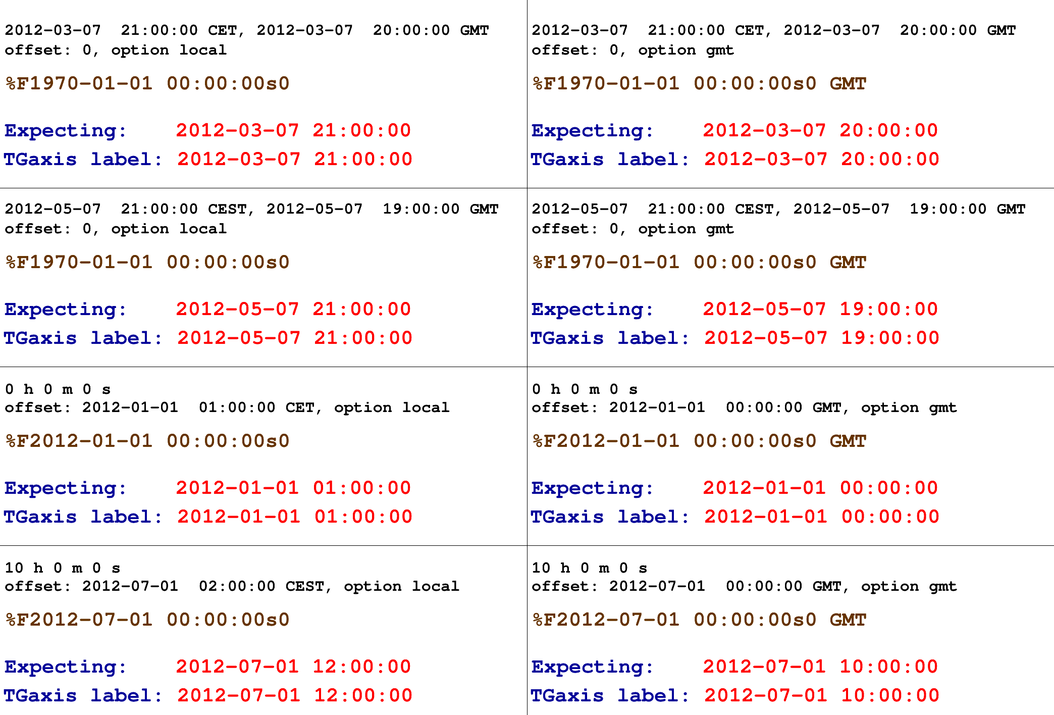 The following example compares what the system time function gmtime and localtime give with what gives TGaxis. It can be used as referenced test to check if the time option of TGaxis is working properly.