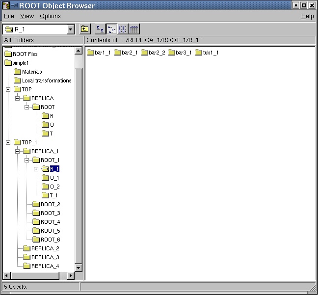 Provided that a geometry was successfully built and closed (for instance the previous example $ROOTSYS/tutorials/visualisation/geom/rootgeom.C ), the manager class will register itself to ROOT and the logical/physical structures will become immediately browsable. The ROOT browser will display starting from the geometry folder : the list of transformations and media, the top volume and the top logical node. These last two can be fully expanded, any intermediate volume/node in the browser being subject of direct access context menu operations (right mouse button click). All user utilities of classes TGeoManager, TGeoVolume and TGeoNode can be called via the context menu.