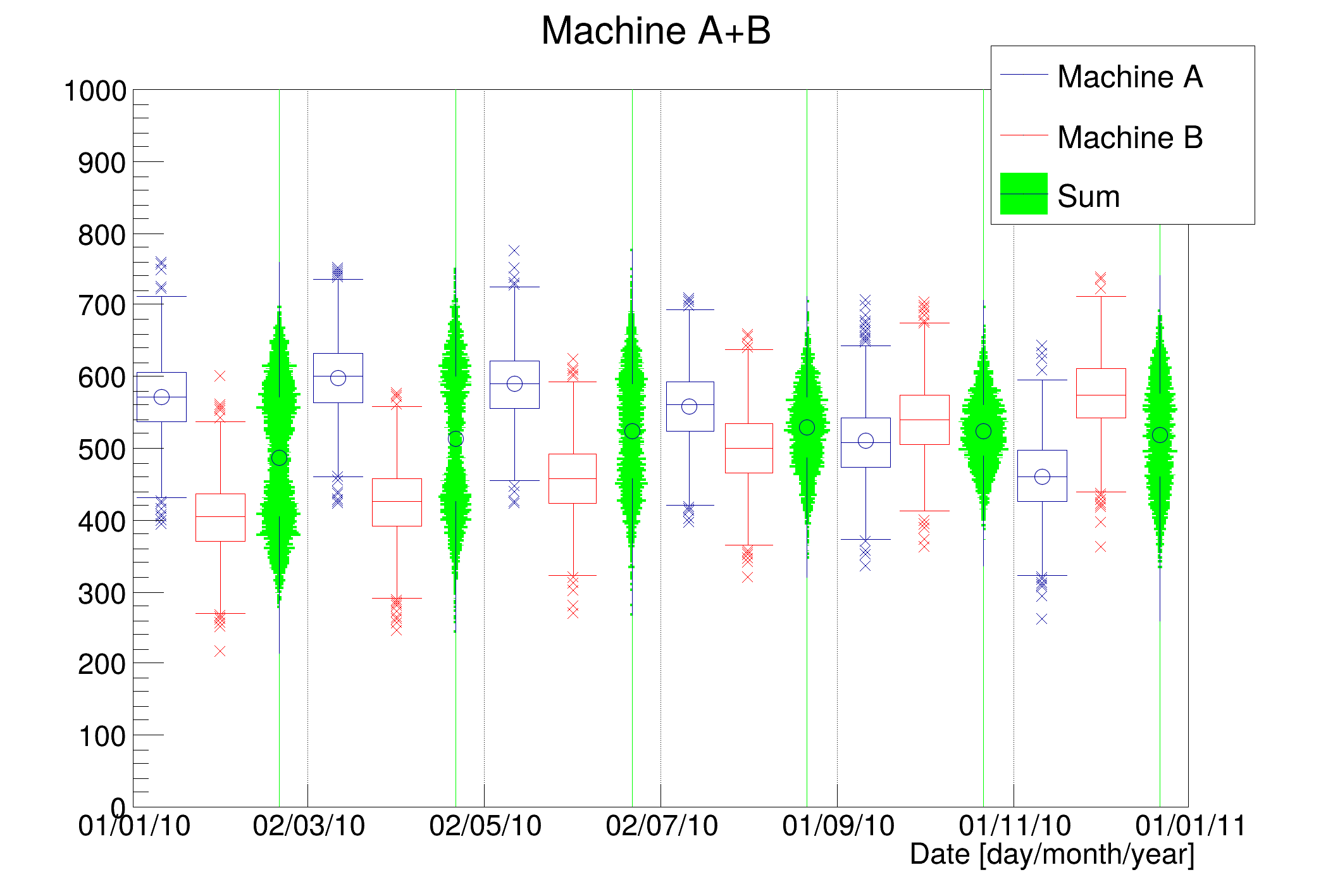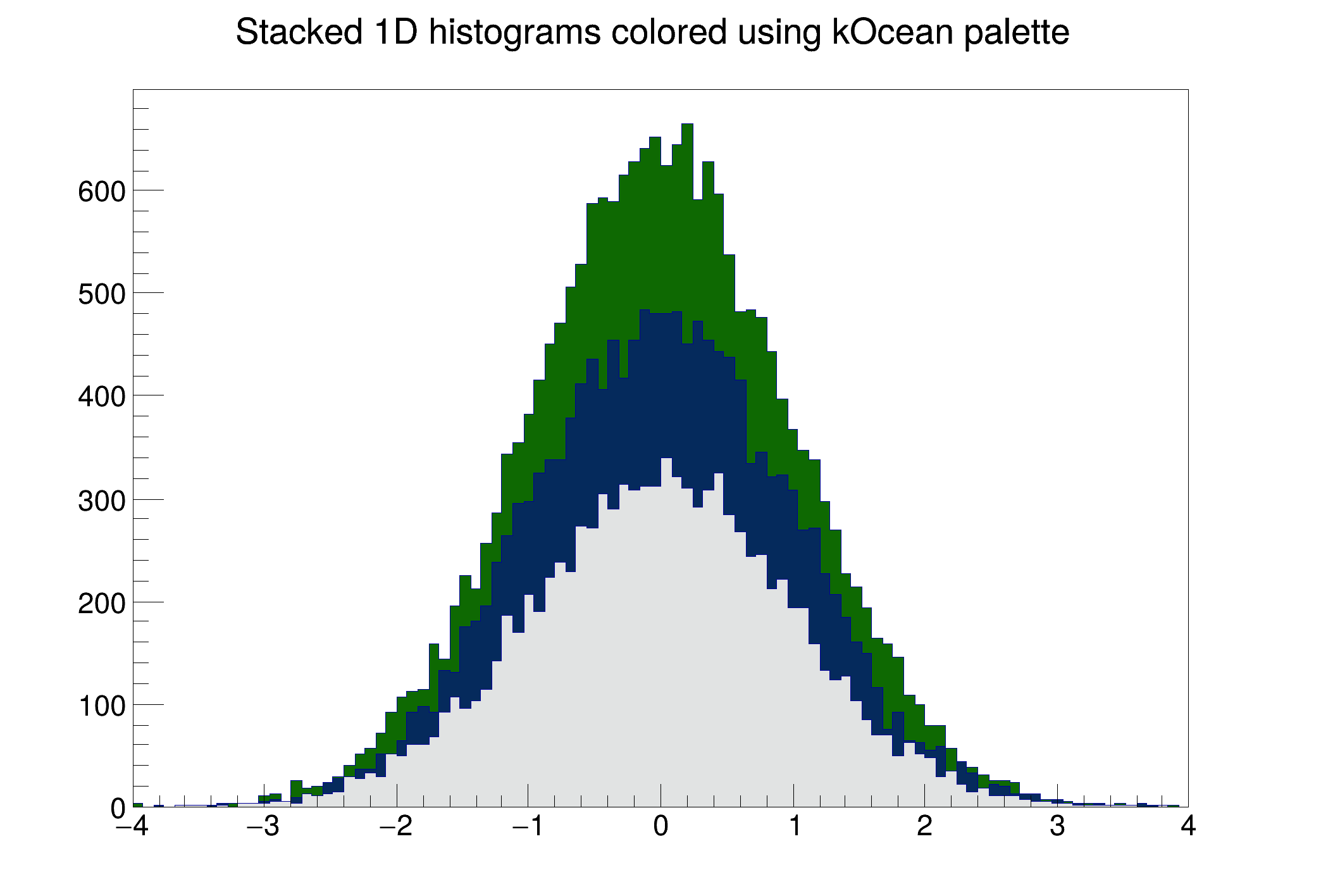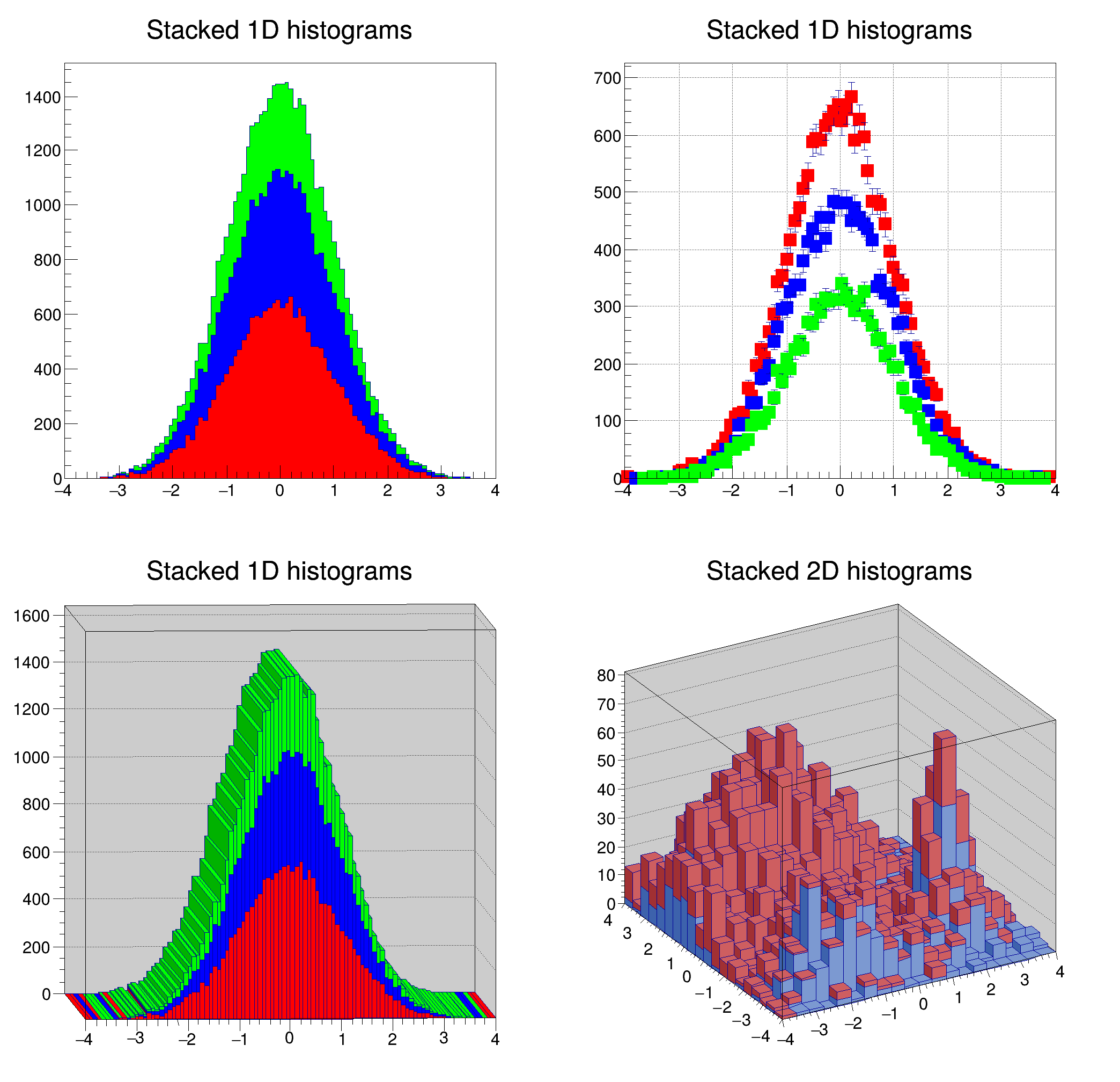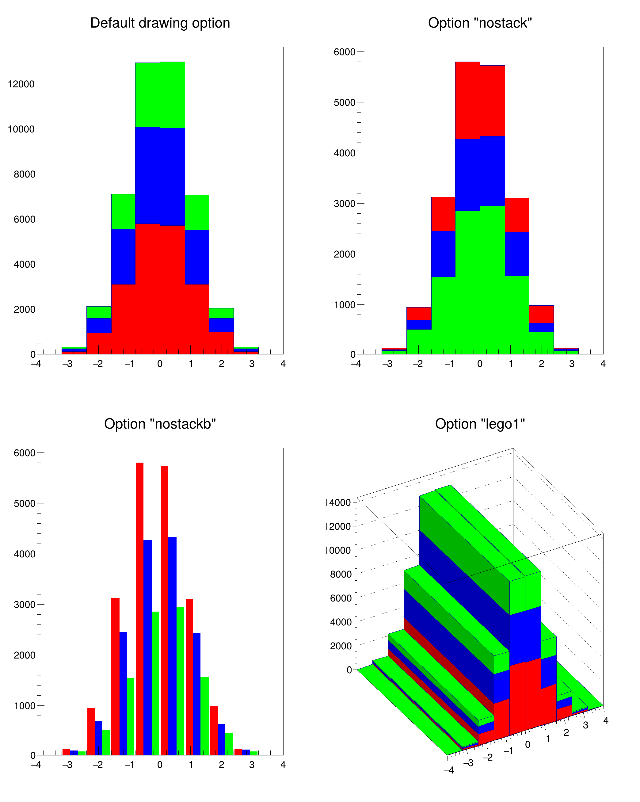 Options to draw histograms are described in THistPainter::Paint By default (if the option "nostack" is not specified), histograms will be painted stacked on top of each other.