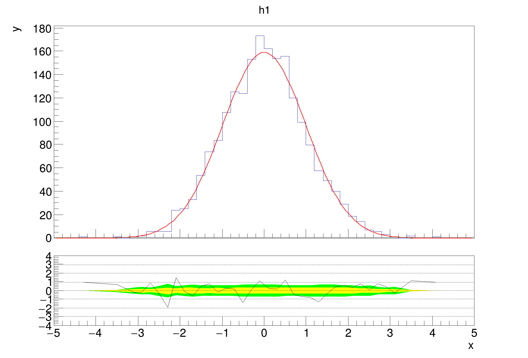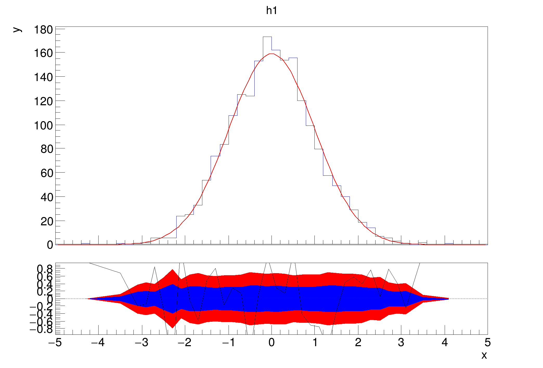 A second constructor only accepts a single histogram, but expects it to have a fitted function. The function is used to calculate the residual between the fit and the histogram. Here, it is expected that h1 has a fit function in it's list of functions. The class calculates the difference between the histogram and the fit function at each point and divides it by the uncertainty. There are a few option to steer which error is used (as is the case for diffsig). The default is to use the statistical uncertainty from h1 using TH1::GetBinError. If the option string contains errasym, asymmetric errors will be used. The type of error can be steered by TH1::SetBinErrorOption. The corresponding error will be used, depending on if the function is below or above the bin content. The third option errfunc uses the square root of the function value as the error.