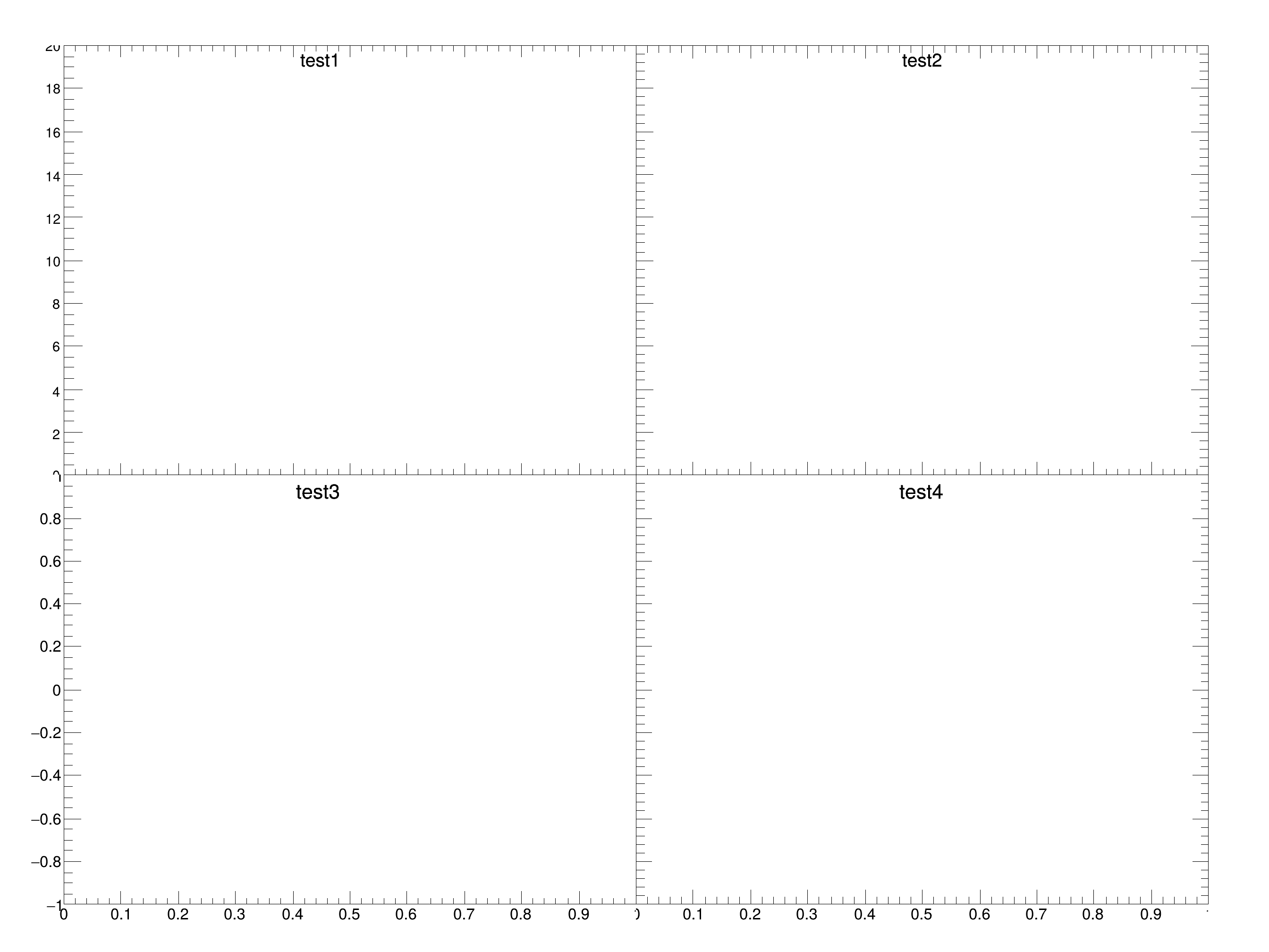 Note that the last 2 arguments in c1->Divide(2,2,0,0) define 0 space between the pads. With this, the axis labels where the pads touch may be cut, as in this tutorial. To avoid this, either add some spacing between pads (instead of 0) or change the limits of the plot in the pad (histos in this tutorial). E.g. h3 could be defined as TH2F *h3 = new TH2F("h3","test3",10,0,1,22,-1.1,1.1); but note that this can change the displayed axis labels (requiring SetNdivisions to readjust).